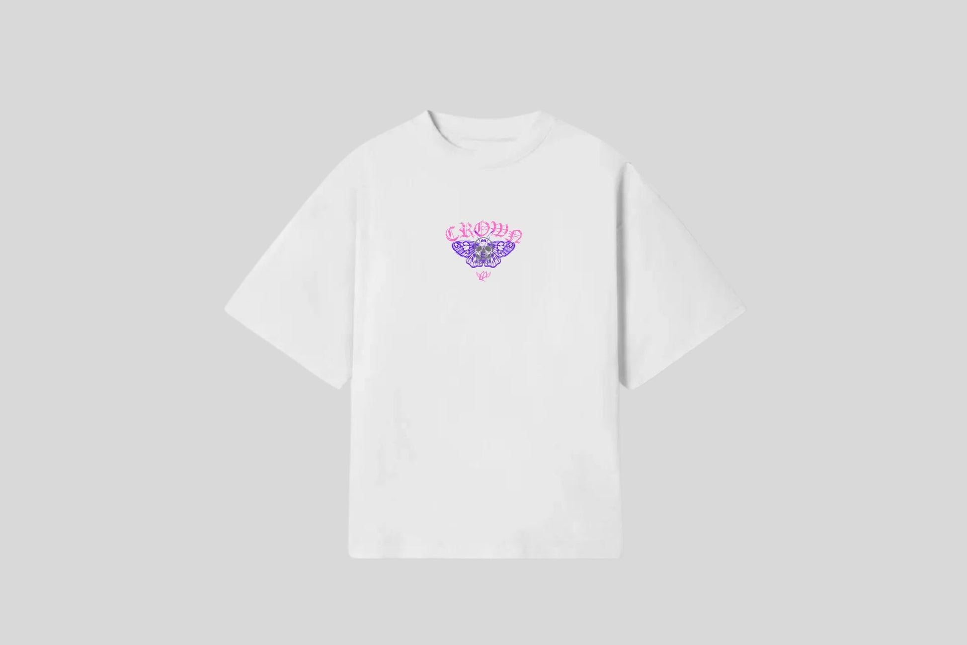 Pureza con fuerza angelical. Tee blanca con mariposa púrpura en la espalda y detalles frontales minimalistas. Un balance entre elegancia y rebeldía.